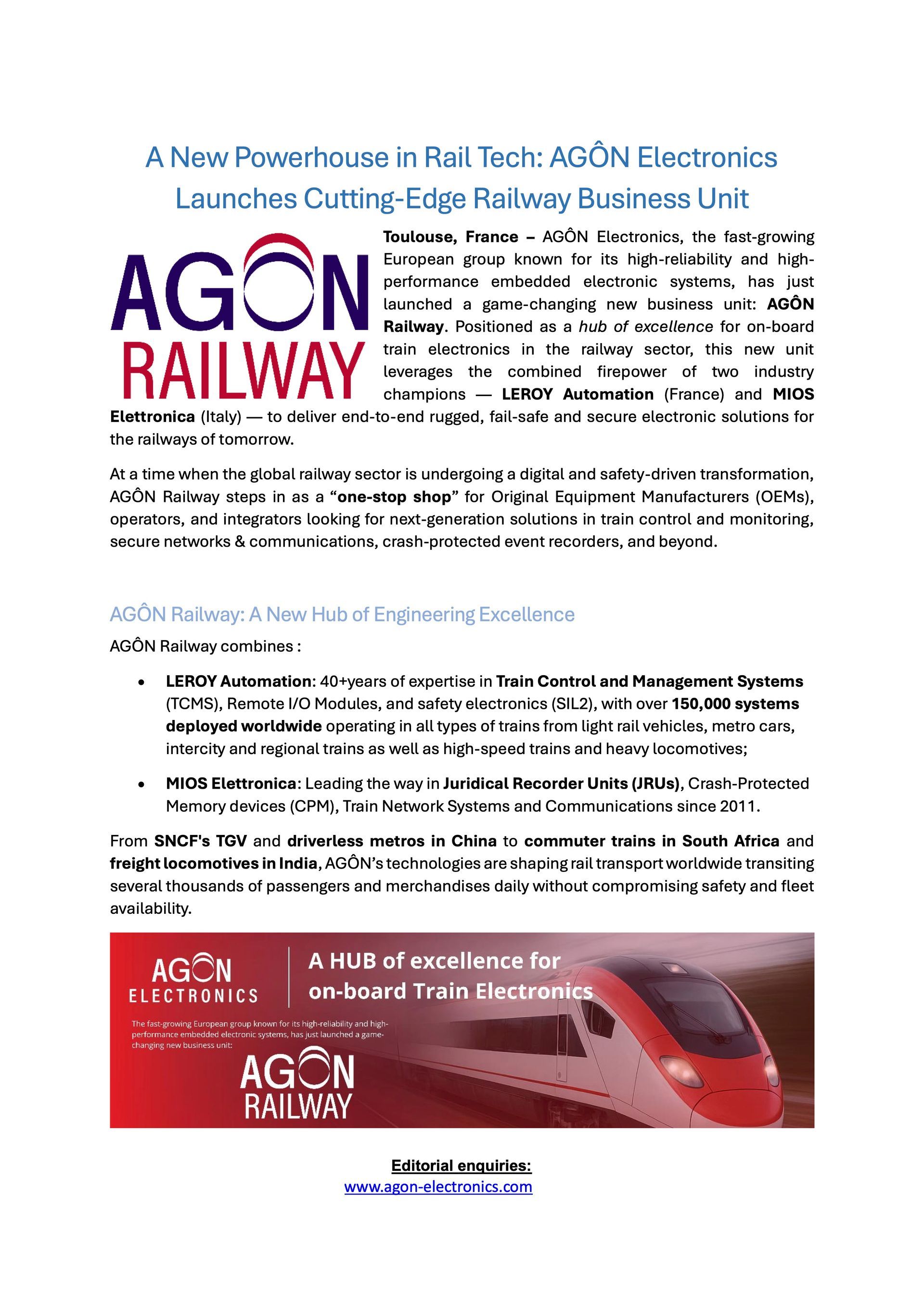 AGÔN Electronics, the fast-growing European group known for its high-reliability and high- performance embedded electronic systems, has just launched a game-changing new business unit: AGÔN Railway. Positioned as a hub of excellence for on-board train electronics in the railway sector, this new unit leverages the combined firepower of two industry champions — LEROY Automation (France) and MIOS Elettronica (Italy) — to deliver end-to-end rugged, fail-safe and secure electronic solutions for the railways of tomorrow.
