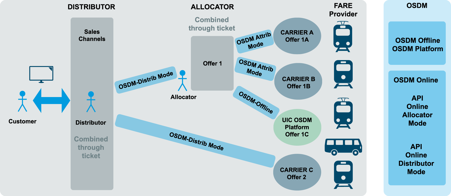 The complexity of purchasing rail tickets is a disincentive for customers to switch to rail, especially for international journeys that include connections to public transport. UIC and Ticket Vendors have therefore developed the concept of OSDM (Open Sales and Distribution Model) to simplify the purchase of tickets, and to enable all ticketing stakeholders to have common standards and procedures. The Open Sales and Distribution Model (OSDM) is a rail sector specification enabling interoperable ticket sales for trains and other modes of transport and is defined in the new UIC International Railway Solution (IRS) 90918-10.