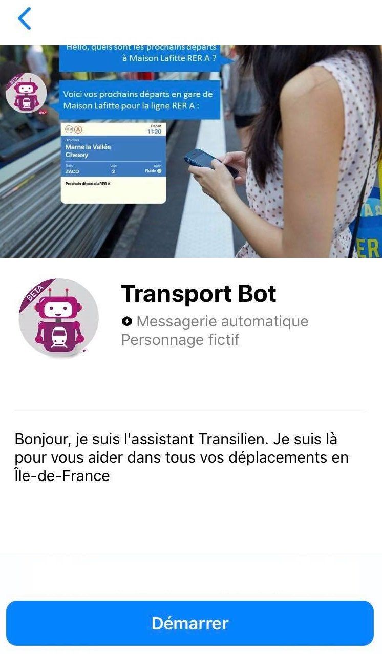 Chatbot Transilien for passengers using metro, rail, and tram services in Ile-de-France (Paris and its region). In beta since 14 January on Facebook Messenger and Twitter, it provides information on timetables, route and network plans, fares and tickets, purchasing options, claim and contact forms.