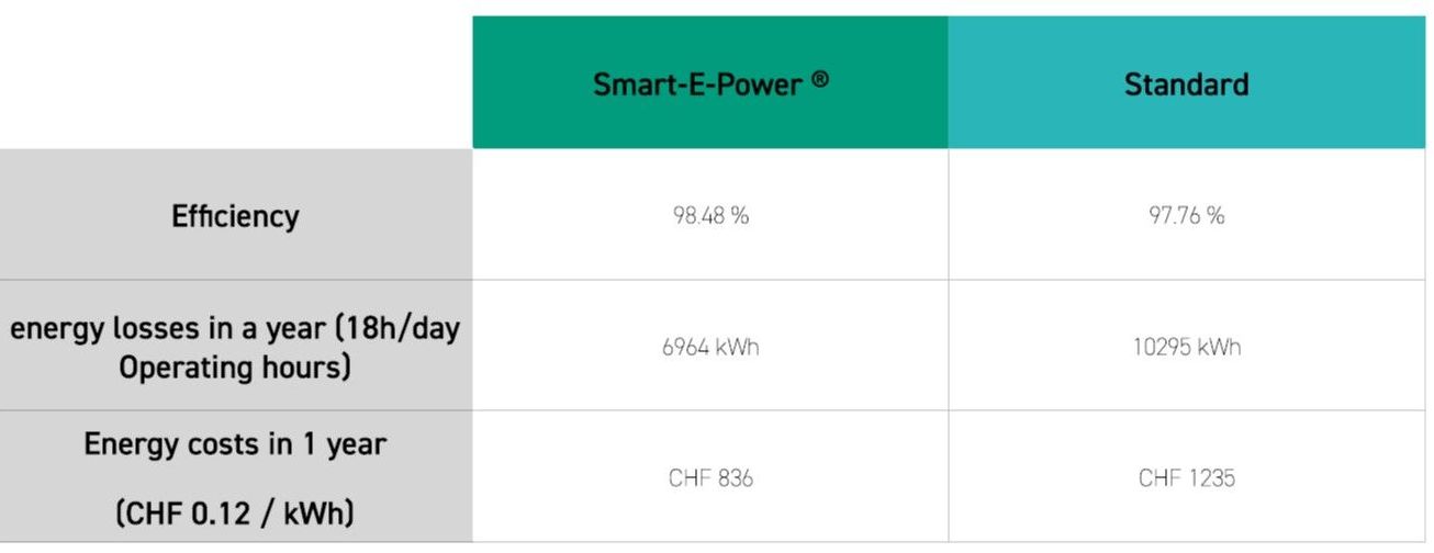 It is observable, that the efficiency of the Smart-E-Power® products has one percent higher efficiency than the standard variant. Hence, there are less energy losses, since in total the standard product generates approx. 3’300 kWh more energy losses per year. Since the lower energy demand means that the annual energy costs are lower. Based on the Swiss energy price of CHF 0.12 per kWh, you can save CHF 400 per year when using the Smart-E-Power product. Due to the high-quality materials in the Smart-E-Power range, the load on the component is lower.