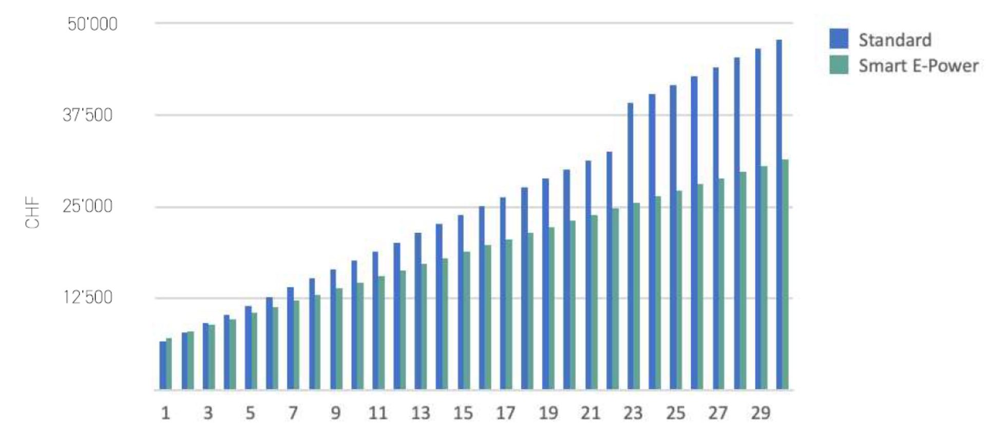 As you can see in the following graph, the Smart-E-Power® product already shows a positive cost balance after the third year. The somewhat higher procurement costs of the Smart-E-Power® product due to the use of high-quality materials pay for themselves after a short time.