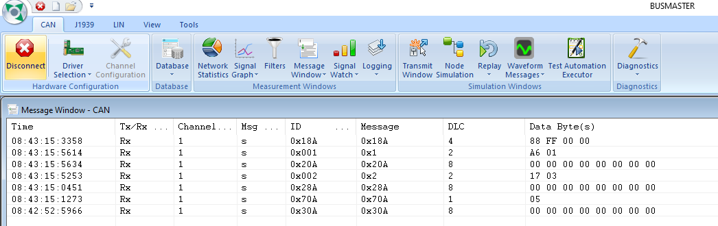 CAN communication can be monitored through the PC with a specific CAN network software: the tool used here is “Busmaster” software. An USB/CAN converter is used to connect the PC to the CAN network. All CAN messages and the bus load can be monitored.