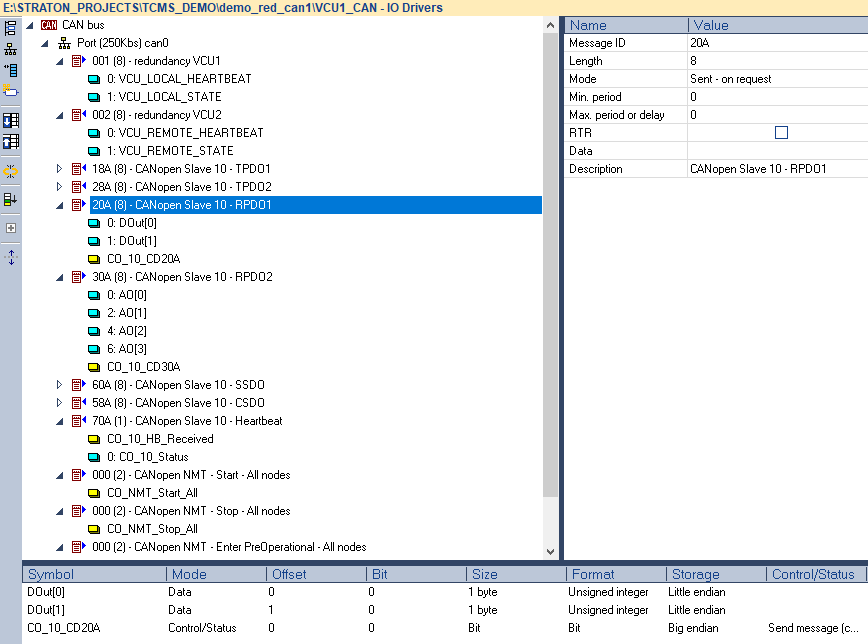 - CAN Message ID 20A, 30A are RPDO messages sent to CANopen slave number 10 only when the VCU is active and then set the message control variable, as the “CO_10_CD10A” variable for message ID 20A.