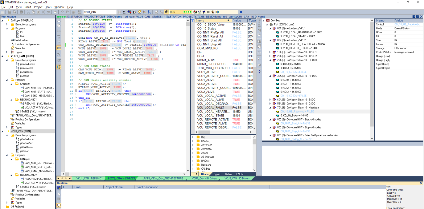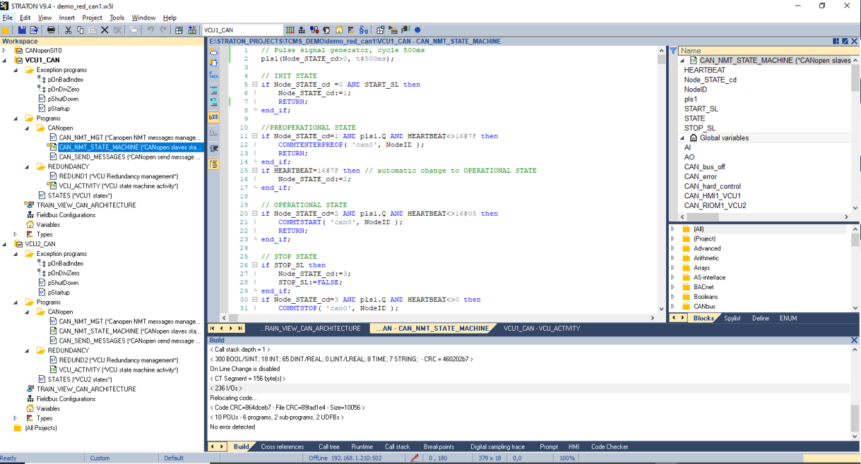 - CANopen NMT messages management: “REDUND” program. Only the active VCU will send NMT messages and manage the CANopen slaves. Call to a CANopen State Machine function block instance for each CANopen slave managed.